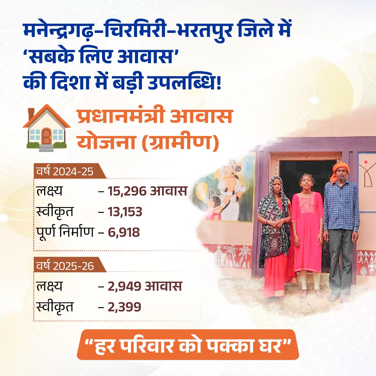 सुरेश मिनोचा एमसीबी : मनेन्द्रगढ़-चिरमिरी-भरतपुर जिले में प्रधानमंत्री आवास योजना (ग्रामीण) के तहत पात्र परिवारों को पक्का घर उपलब्ध कराने का कार्य तेजी से जारी है। वर्ष 2024-25 एवं 2025-26 के लिए निर्धारित लक्ष्य एवं स्वीकृत आवासों की संख्या के अनुसार जिले में उल्लेखनीय प्रगति दर्ज की गई है।