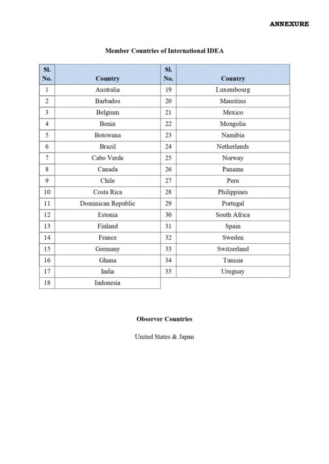 3. अंतर्राष्ट्रीय IDEA, जिसकी स्थापना 1995 में हुई थी, एक अंतर-सरकारी संगठन है जो दुनिया भर में लोकतांत्रिक संस्थानों और प्रक्रियाओं को मजबूत करने के लिए प्रतिबद्ध है। वर्तमान में 35 देशों की सदस्यता और संयुक्त राज्य अमेरिका और जापान के पर्यवेक्षक (Observers) के रूप में, यह संगठन समावेशी, सुदृढ़ और जवाबदेह लोकतंत्रों को बढ़ावा देता है (सदस्य देशों की सूची अनुबंध में है)।