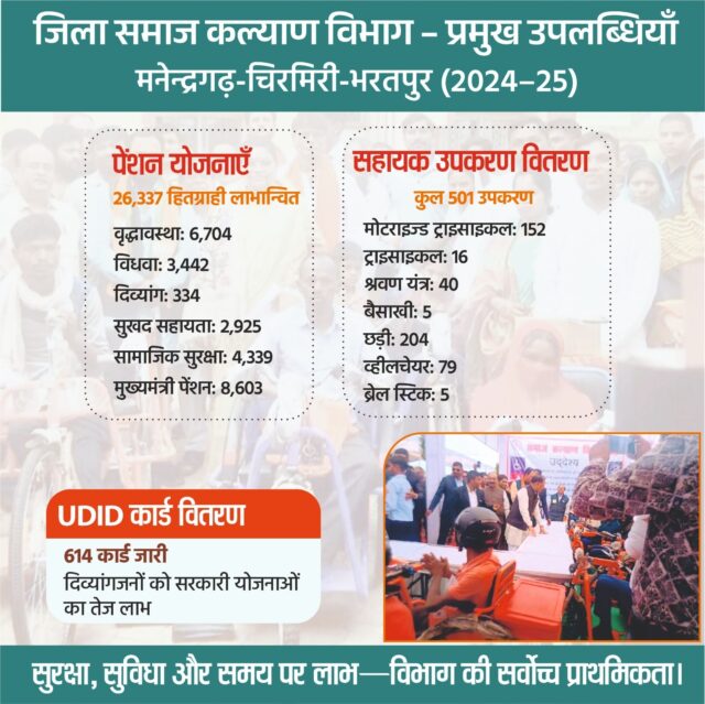 सुरेश मिनोचा एमसीबी : छत्तीसगढ़ के मनेन्द्रगढ़-चिरमिरी-भरतपुर जिले के लिए वर्ष 2024-25 सामाजिक सुरक्षा, संवेदनशीलता और मानव-कल्याण की दृष्टि से अभूतपूर्व उपलब्धियों का वर्ष साबित हुआ। यह वह समय रहा जब सरकारी योजनाएँ केवल कागज़ों पर नहीं रहीं, बल्कि लोगों के जीवन को स्पर्श करते हुए उन्हें वास्तविक सुरक्षा, स्थिरता और सम्मान प्रदान किया। प्रधानमंत्री नरेन्द्र मोदी के सबका साथ, सबका विकास, सबका विश्वास और सबका प्रयास के मंत्र को जिस गम्भीरता से राज्य सरकार ने अपनाया, उसमें एमसीबी जिला पूरे प्रदेश के लिए एक प्रेरक मॉडल बनकर उभरा है। मुख्यमंत्री विष्णुदेव साय के नेतृत्व, समाज कल्याण मंत्री श्रीमती लक्ष्मी राजवाड़े की संवेदनशील कार्यशैली और जिला प्रशासन की मेहनत ने एक ऐसा वातावरण तैयार किया, जहाँ योजनाएँ परिवारों की तकदीर बदलने का माध्यम बन सकीं।
