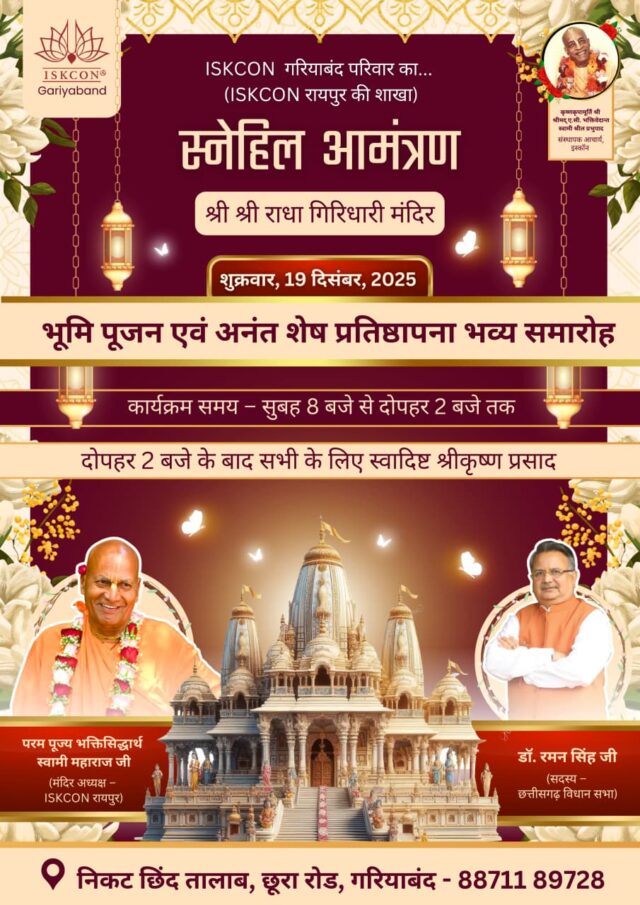 राधेश्याम सोनवानी गरियाबंद:- गरियाबंद नगर भूतेश्वरधाम की धारा में विश्व प्रसिद्ध इस्काॅन संस्था द्वारा गरियाबंद में श्री श्री राधागिरिधारी मंदिर का निर्माण किया जाना है । दिनांक 19 दिसम्बर 2025 दिन-शुक्रवार को पूर्व मुख्यमंत्री एवं अध्यक्ष विधानसभा श्री डाॅ.रमनसिंह द्वारा मंदिर निर्माण के लिए भूमि पूजन किया जाना है । ये भव्य मंदिर छिन्द तालाब के निकट कृषि फार्म से लगी हुई करीब 80,000 स्क्रेवरफीट में किया जायेगा ।