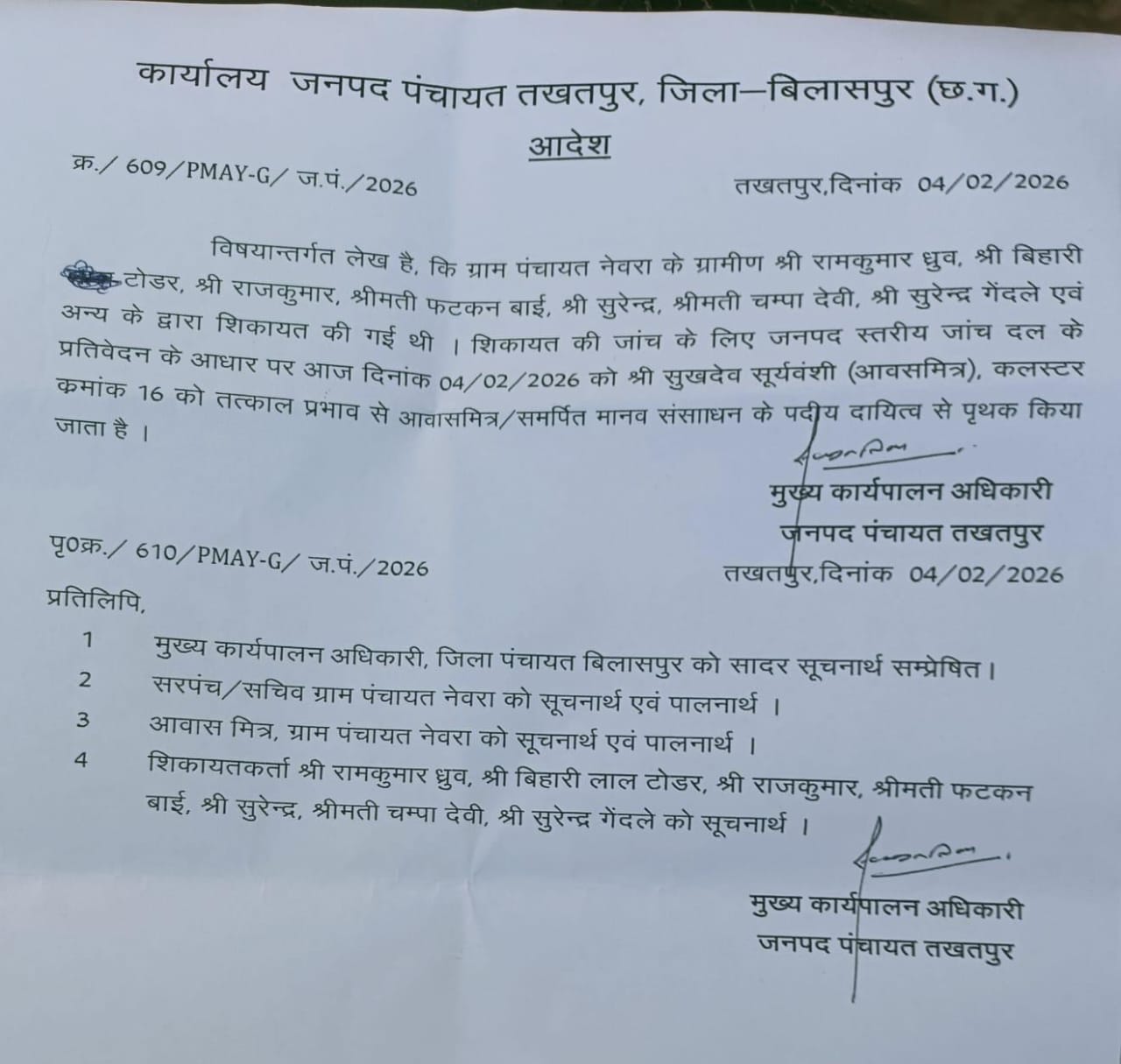 तखतपुर : तखतपुर विधानसभा के ग्राम नेवरा के आवास मित्र सुखदेव सूर्यवंशी आवास मित्र पद से बर्खास्त कर दिया गया है, प्राप्त जानकारी के अनुसार ग्राम नेवरा ब्लाक तखतपुर आवास मित्र सुखदेव सूर्यवंशी का आवास के संबंध में हितग्राहितो से पैसे लेनदेन करने का शिकायत मिला रहे थे , जिसकी जानकारी भाजपा नेता बिहारी सिंह टोडर को जनता ने दी, शिकायत के आधार पर बिहारी सिंह टोडर ने अन्य ग्रामीणों के साथ तखतपुर मुख्य कार्य- पालन अधिकारी से शिकायत किया, जांच टीम गठित कर जांच की गई , शिकायत सही पाए जाने पर आज दिनांक 04 फरवरी 2026 को आवास मित्र सुखदेव सूर्य वंशी को आवास मित्र के पद से पृथक करते हुए बर्खास्त कर दिया गया है,