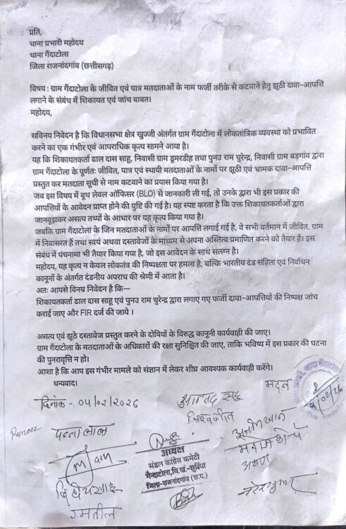 शिकायत में कहा गया है कि यह कृत्य न केवल लोकतंत्र की निष्पक्षता पर हमला है, बल्कि भारतीय दंड संहिता एवं निर्वाचन कानूनों के अंतर्गत दंडनीय अपराध की श्रेणी में आता है। ग्रामीणों ने मांग की है कि झूठी दावा-आपत्ति लगाने वालों के विरुद्ध FIR दर्ज कर सख्त कानूनी कार्रवाई की जाए तथा ग्राम गैंदाटोला के मतदाताओं के अधिकारों की सुरक्षा सुनिश्चित की जाए, ताकि भविष्य में इस तरह की घटनाओं की पुनरावृत्ति न हो।ग्रामीणों का कहना है कि यदि समय रहते इस मामले में कठोर कार्रवाई नहीं की गई, तो आम नागरिकों का लोकतांत्रिक व्यवस्था से विश्वास डगमगा सकता है। वहीं थाना प्रभारी ने शिकायत प्राप्त कर मामले की जांच प्रारंभ करने एवं नियमानुसार कार्रवाई का आश्वासन दिया है।इस अवसर पर प्रकाश शर्मा, राजिल कुरैशी,नरेंद्र मानिकपुरी,मनोज कोचे,पन्नालाल देवांगन,उत्तम सोनी,चम्मन साहू,गोलू साहू,अजय साहू,अजीम खान सहित अनेक ग्रामीण व प्रभावित मतदाता शामिल रहे।