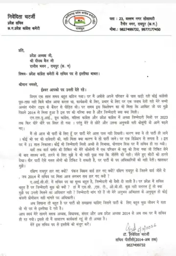 इस्तीफे में निवेदिता चटर्जी ने संगठन में लंबे समय से उपेक्षा और जिम्मेदारी न मिलने का आरोप लगाया है। उन्होंने पत्र में लिखा है कि पिछले 11 वर्षों से वे पार्टी के लिए लगातार कार्य कर रही हैं, लेकिन इसके बावजूद उन्हें कोई ठोस जिम्मेदारी या अवसर नहीं दिया गया। निवेदिता चटर्जी ने अपने इस्तीफे में लिखा कि वह वर्ष 2014 से लगातार PCC सचिव के पद पर बनी रहीं, जबकि उनके सामने कई नेता ब्लॉक अध्यक्ष, विधायक और सांसद बने और बाद में प्रदेश अध्यक्ष जैसे बड़े पदों तक पहुंचे। उन्होंने लिखा कि मेरे सामने दीपक बैज ब्लॉक अध्यक्ष बने, विधायक बने, सांसद बने और अंततः प्रदेश अध्यक्ष भी बने, लेकिन मैं 2014 से आज तक सचिव ही रह गई।