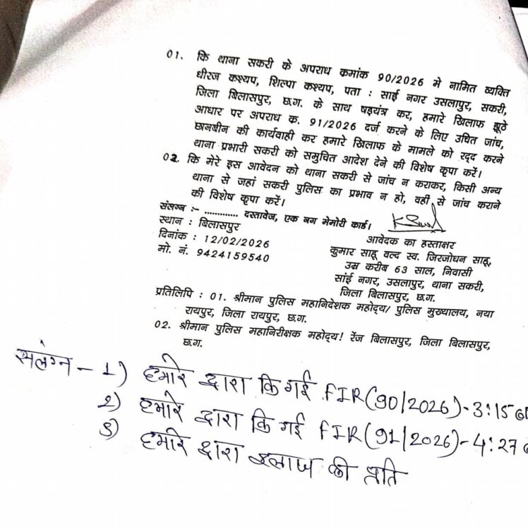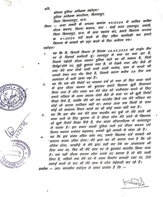 बिलासपुर: शहर के सकरी थाना क्षेत्र से एक सनसनीखेज मामला सामने आया है, जहां एक रिटायर्ड लाइनमैन ने पुलिस विभाग में पदस्थ पड़ोसी पर गंभीर आरोप लगाए हैं। साईं नगर उसलापुर निवासी आवेदक ने पुलिस अधीक्षक बिलासपुर को आवेदन सौंपते हुए सकरी थाना में दर्ज अपराध क्रमांक 90/2026 और 91/2026 को निरस्त करने तथा पूरे मामले की स्वतंत्र व निष्पक्ष जांच कराने की मांग की है।