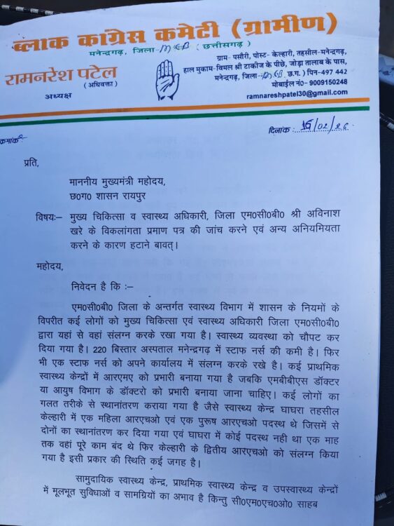 ब्लॉक कांग्रेस कमेटी (ग्रामीण) मनेन्द्रगढ़ के अध्यक्ष रामनरेश पटेल ने मुख्यमंत्री से सीएमएचओ के विकलांगता प्रमाण पत्र सहित अन्य आरोपों की निष्पक्ष जांच कर तत्काल हटाने और उचित कार्यवाही की मांग की है साथ ही चेतावनी दी है कि यदि शीघ्र कार्यवाही नहीं की गई तो आंदोलन किया जायेगा।