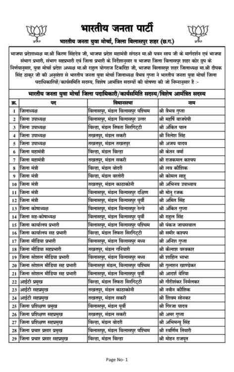 युवा मोर्चा के प्रदेश अध्यक्ष राहुल योगराज टिकरिहा और भाजपा बिलासपुर शहर जिलाध्यक्ष दीपक सिंह ठाकुर की अनुशंसा पर जिलाध्यक्ष वैभव गुप्ता ने जिला पदाधिकारियों, कार्यसमिति सदस्यों एवं विशेष आमंत्रित सदस्यों की सूची जारी की।