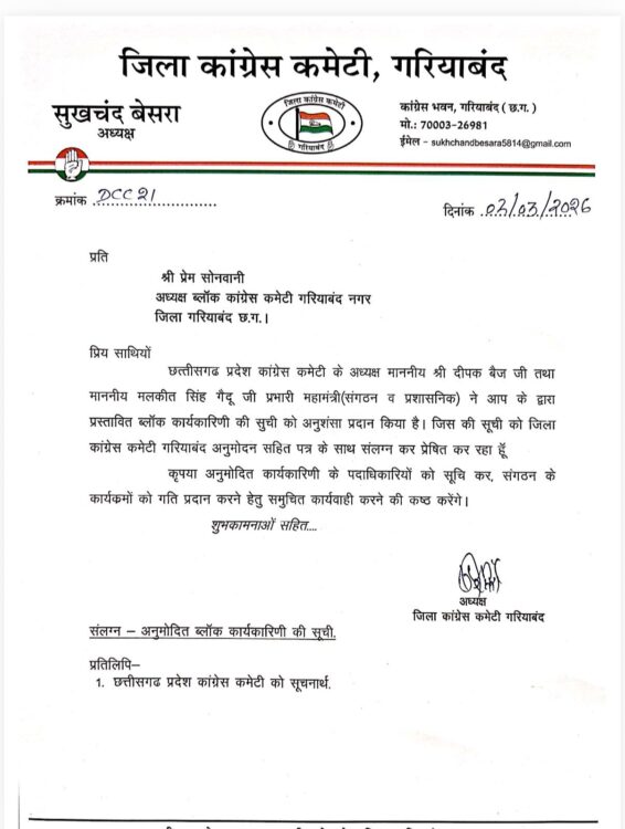जारी पत्र (क्रमांक डीसीसी/21, दिनांक 03 मार्च 2026) के अनुसार, छत्तीसगढ़ प्रदेश कांग्रेस कमेटी के अध्यक्ष Deepak Baij तथा प्रभारी महामंत्री (संगठन व प्रशासनिक) मलकीत सिंह गैंदु ने ब्लॉक कांग्रेस कमेटी गरियाबंद नगर की प्रस्तावित कार्यकारिणी सूची को अनुशंसा प्रदान कर दी है।