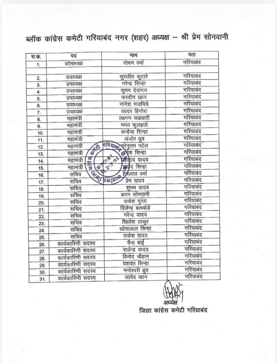 राधेश्याम सोनवानी गरियाबंद: जिला कांग्रेस कमेटी गरियाबंद के अध्यक्ष सुखचंद बेसरा ने ब्लॉक कांग्रेस कमेटी गरियाबंद नगर (शहर) की प्रस्तावित कार्यकारिणी को प्रदेश स्तर से मिली मंजूरी की जानकारी देते हुए औपचारिक पत्र जारी किया है।