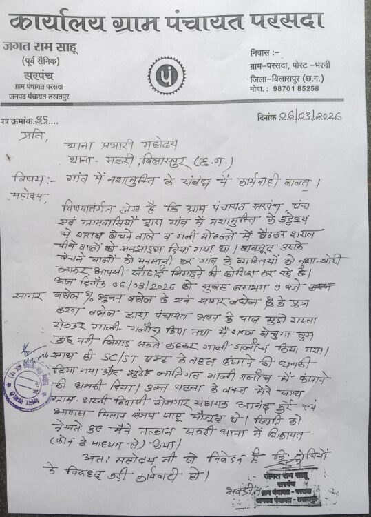 अमन पथ न्यूज बिलासपुर। (कैलाश वस्त्रकार) : सकरी थाना क्षेत्र अंतर्गत ग्राम पंचायत परसदा में अवैध शराब बिक्री का मामला सामने आया है। जिसमें ग्राम के ही व्यक्ति 1सागर बघेल पिता भुवन बघेल 2 करन बघेल पिता सागर बघेल द्वारा अवैध शराब बिक्री किया जाता है जिसकी शिकायत ग्राम पंचायत के सरपंच जगत राम साहू ने थाना प्रभारी, सकरी विजय चौधरी को पत्र लिखकर गांव में अवैध शराब की बिक्री पर रोक लगाने तथा विशेष पेट्रोलिंग की व्यवस्था करने की मांग की है। सरपंच द्वारा भेजे गए पत्र में उल्लेख किया गया है कि ग्राम पंचायत परसदा में इन दिनों अवैध शराब की बिक्री जोरों पर है, जिससे गांव का माहौल प्रभावित हो रहा है। जिससे नशे की हालत में अनावश्यक विवाद और झगड़े की स्थिति निर्मित होती है जिससे कानून व्यवस्था की समस्या उत्पन होने की संभावना बनी रहती है पत्र में पुलिस प्रशासन से अनुरोध किया गया है कि गांव में नियमित पेट्रोलिंग वाहन भेजा जाए तथा अवैध शराब बेचने वालों के खिलाफ सख्त कार्रवाई की जाए, ताकि क्षेत्र में शांति एवं सौहार्दपूर्ण वातावरण बना रहे। सरपंच ने कहा है कि समय रहते ठोस कदम उठाए जाने से संभावित विवादों और अप्रिय घटनाओं पर अंकुश लगाया जा सकता है।