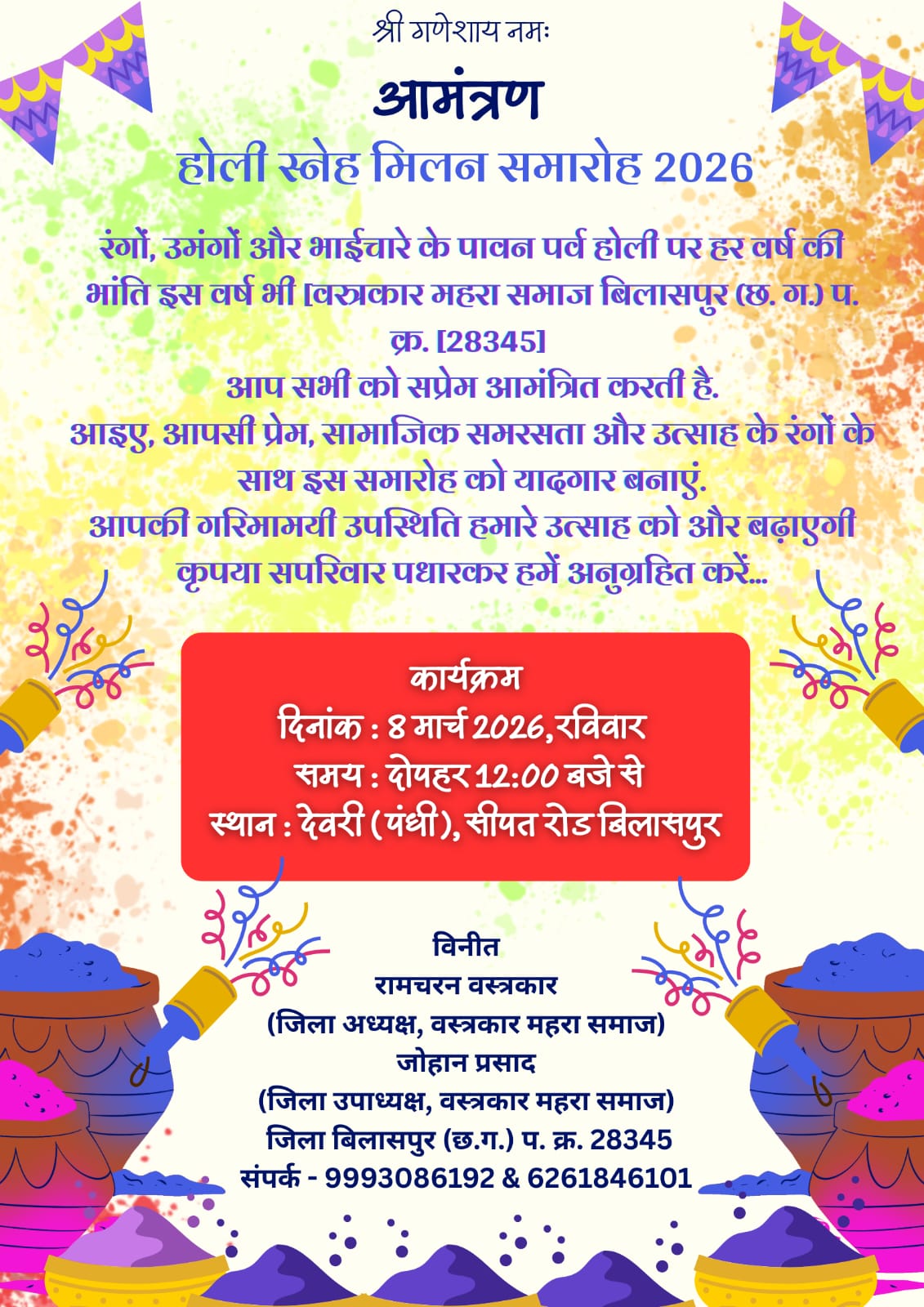 रंगों, उमंगों और भाईचारे के पावन पर्व होली पर हर वर्ष की भांति इस वर्ष भी [वस्त्रकार महरा समाज बिलासपुर (छ. ग.) प. क्र. [28345] आप सभी को सप्रेम आमंत्रित करती है। आइए, आपसी प्रेम, सामाजिक समरसता और उत्साह के रंगों के साथ इस समारोह को यादगार बनाएं।