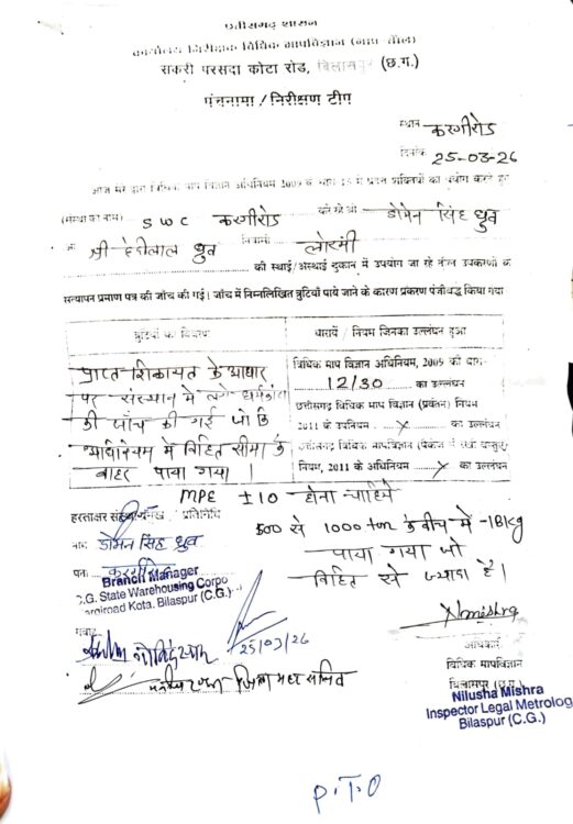 बिलासपुर। (कैलाश वस्त्रकार) : विकासखंड कोटा के वेयरहाउस में स्थापित धर्मकांटा में बड़ी गड़बड़ी सामने आई है। जांच में पुष्टि हुई है कि राशन की तौल में कमी की जा रही थी, जिससे उचित मूल्य दुकानों को प्रतिमाह कम सामग्री मिल रही थी।जानकारी के अनुसार, क्षेत्र के राशन दुकानदार लंबे समय से तौल में अंतर की शिकायत कर रहे थे। वेयरहाउस से लोड होकर निकलने वाले वाहनों का वजन जब अन्य धर्मकांटों में कराया गया तो राशन कम पाया गया। इस संबंध में कई बार शिकायत की गई, लेकिन कोई ठोस कार्रवाई नहीं हुई।