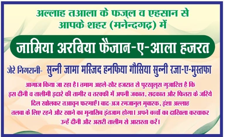 मनेन्द्रगढ : एमसीबी जिला मनेन्द्रगढ शहर की मरकज मस्जिद सुन्नी जामा मस्जिद हनफिया गौसिया मौहारपारा मनेन्द्रगढ अहले सुन्नत के मस्लक की हिफाज़त और बाअमल उलेमा की तैयारी का मजबूत इदारा अल्हम्दुलिल्लाह! दीनी तालीम के फ़रोग और मस्लक-ए-अहले सुन्नत व जमाअत (मस्लक-ए-आला हज़रत) की सही तर्ज़ पर इशाअत के लिए जामिआ अरबिया फ़ैज़ान-ए-आला हज़रत का शानदार क़ियाम किया गया है। यह इदारा तलबा को कुरआन व सुन्नत, फ़िक्ह-ए-हनफ़ी और सही अकीदों की मजबूत तालीम देकर उन्हें एक मुकम्मल और बाअमल आलिम बनाने के अज़्म के साथ आगे बढ़ रहा है।