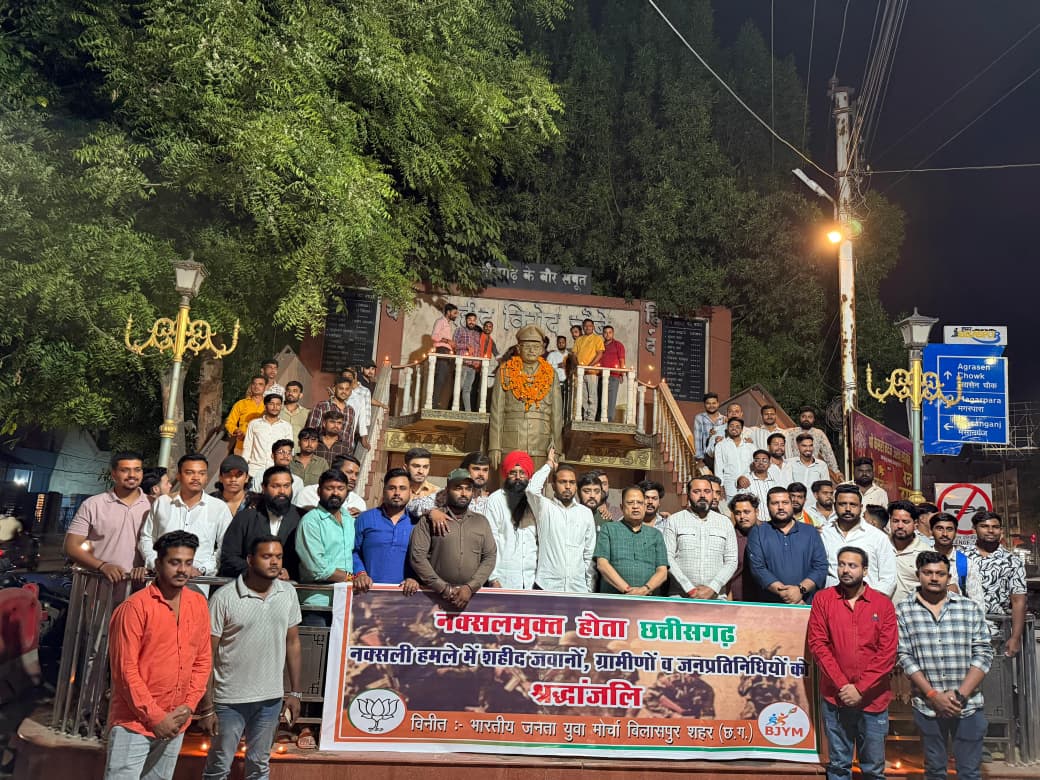 बिलासपुर (कैलाश वस्त्रकार) : छत्तीसगढ़ के नक्सल मुक्त होने की ऐतिहासिक उपलब्धि के उपलक्ष्य में भारतीय जनता युवा मोर्चा, जिला बिलासपुर द्वारा सत्यम चौक स्थित शहीद विनोद चौबे जी की स्मृति में श्रद्धांजलि एवं दीपदान कार्यक्रम का भव्य आयोजन किया गया। इस अवसर पर उपस्थित जनसमूह ने शहीदों के प्रति अपनी श्रद्धा अर्पित करते हुए दीप प्रज्वलित कर उनके बलिदान को नमन किया।