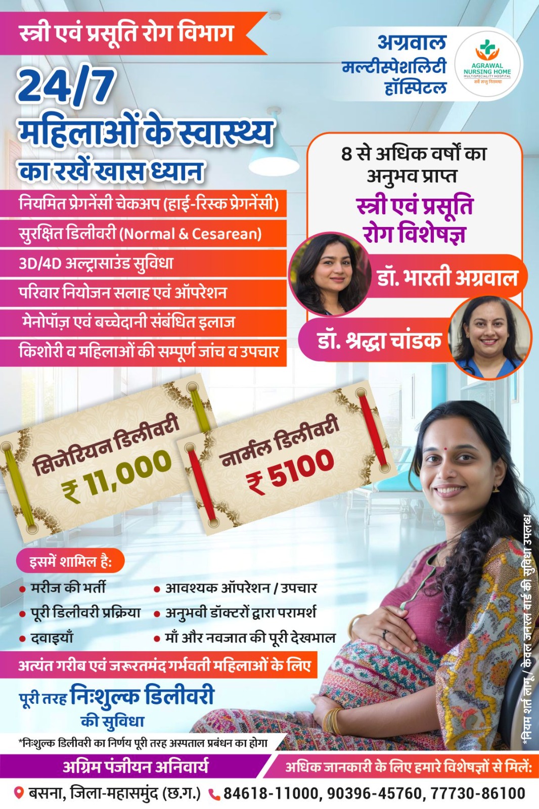 महासमुंद : बसना स्थित अग्रवाल नर्सिंग होम में महिला स्वास्थ्य व प्रसव हेतु विशेष सुविधा शुरू की गई है। अस्पताल संचालक डॉ अमित अग्रवाल ने बताया कि विशेष सुविधा के तहत स्त्री एवं प्रसूति विभाग में 24×7 महिला स्वास्थ्य सुविधा के तहत नियमित प्रेग्नेंसी चेकअप(हाई रिस्क प्रेग्नेंसी) सुरक्षित डिलीवरी( नॉर्मल व सिजेरियन) 3D/4D अल्ट्रासाउंड सुविधा, परिवार नियोजन सलाह एवं ऑपरेशन, किशोरी व महिलाओं की सम्पूर्ण जांच व उपचार की सुविधा शामिल है। इसके अलावा सिजेरियन डिलीवरी 11 हजार में जबकि नॉमर्ल डिलीवरी 5100 सौ रुपए में किए जाने की विशेष सुविधा दी जा रही है। इसमें मरीज की भर्ती, आवश्यक ऑपरेशन, उपचार पूरी डिलीवरी प्रकिया। दवाइयां मा और नवजात बच्चे की पूरी देखभाल शामिल है। यह सब 8 वर्षो से अधिक अनुभव प्राप्त स्त्री एवं प्रसुति रोग विशेषज्ञ अनुभुवी चिकित्सकों डॉ भारती अग्रयाल, डॉ श्रद्धा चांडक की देखरेख परामर्श होगा। डॉ अग्रवाल ने बताया अंत्यत गरीब और जरूरतमंद महिलाओं के लिए डिलीवरी पूर्णता निःशुल्क रहेगी। इस सम्बंध में अधिक जानकारी के लिए अग्रवाल नर्सिंग होम 8461811000,9039645760,7773086100 के इन नम्बरों पर संपर्क या अस्पताल पहुंचकर ली जा सकती है।